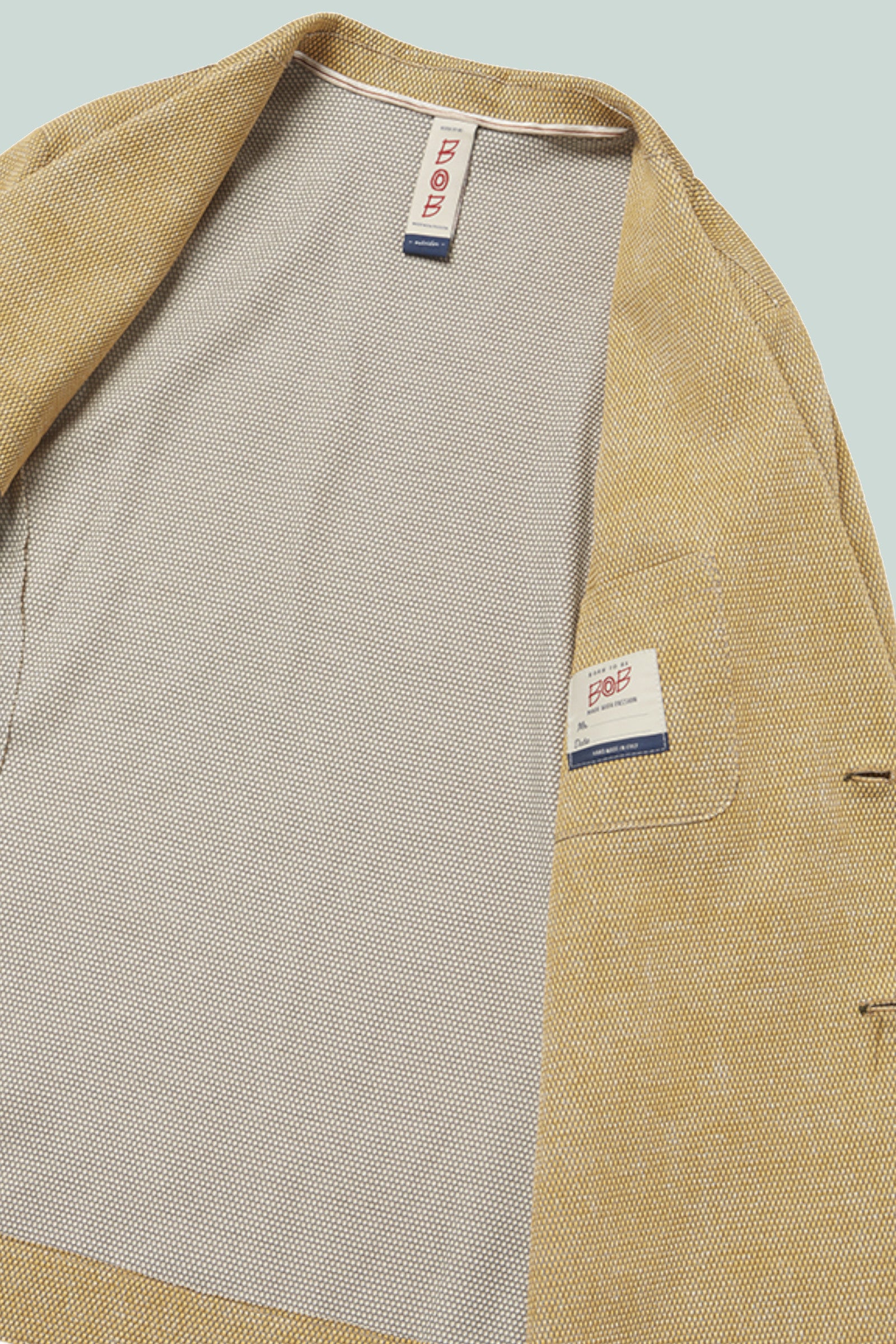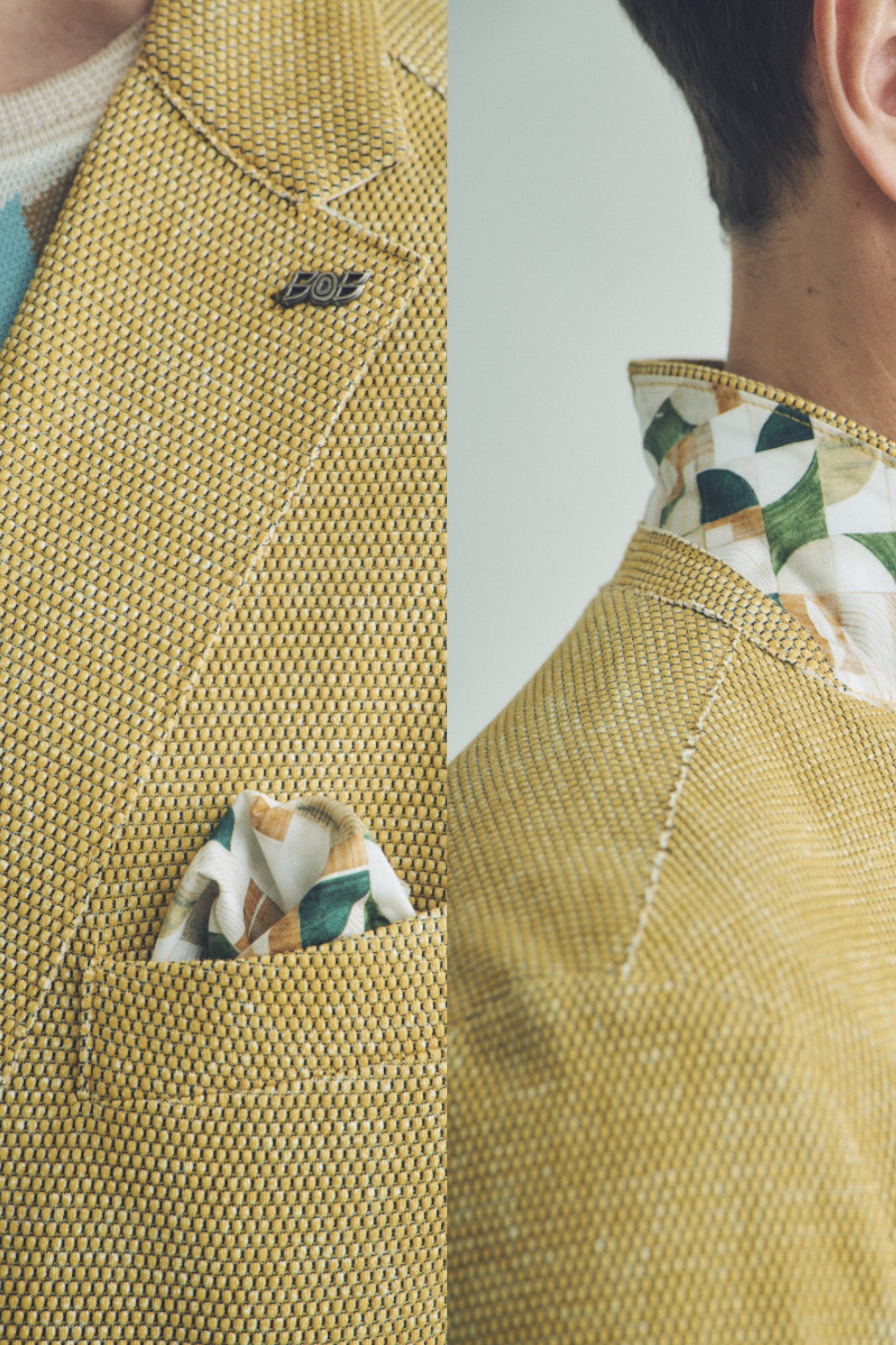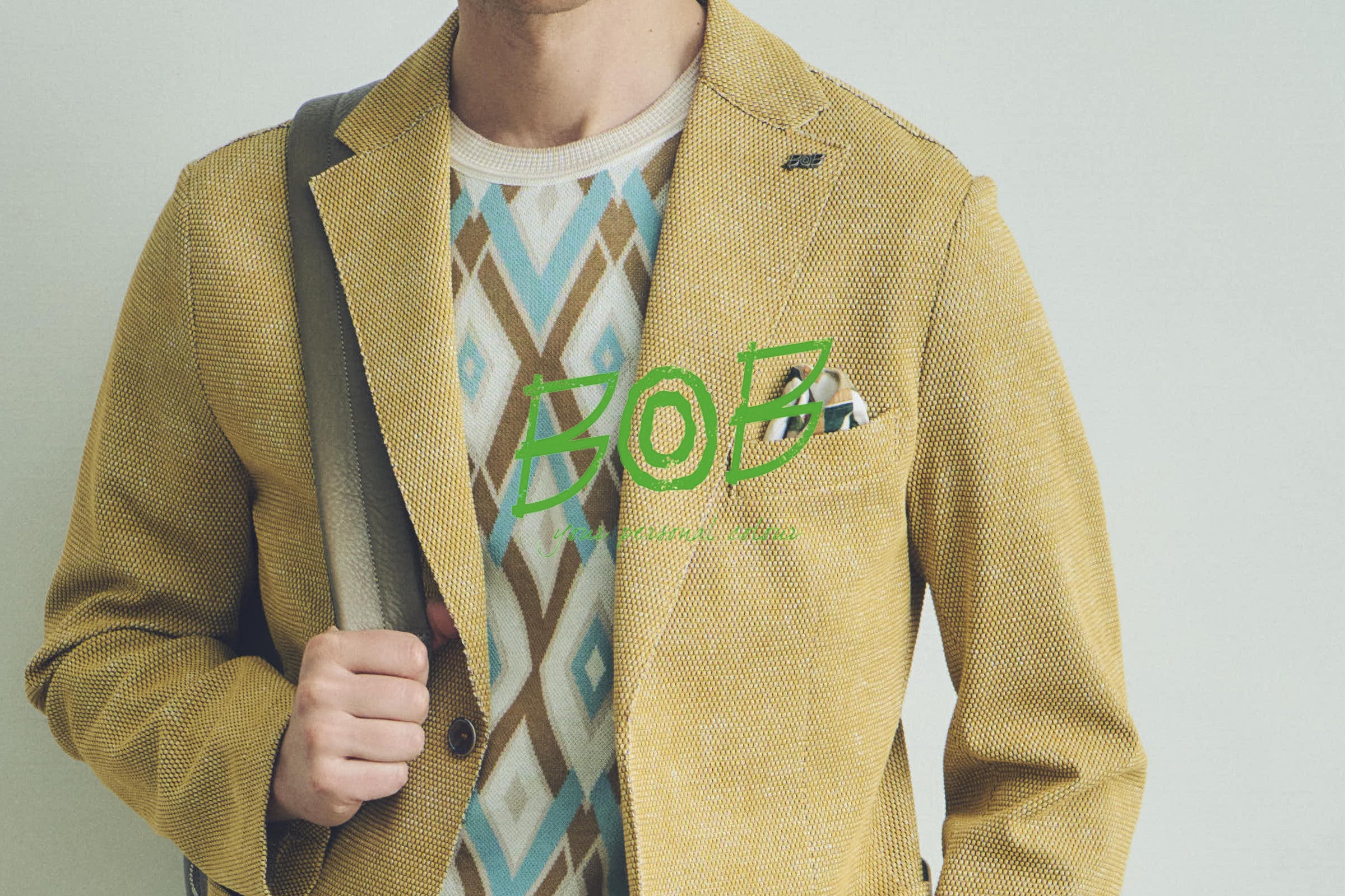 ラペルに輝く「BOB」のロゴピンや、胸ポケットから覗く幾何学柄のフェイクチーフ。